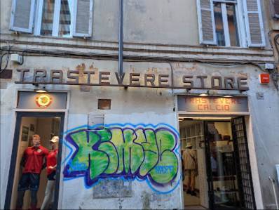 Il negozio, situato in una delle vie più vivaci e affollate del quartiere Trastevere, si distingue per la sua vetrina luminosa e ricca di prodotti, invitando i clienti a entrare e scoprire il mondo del Trastevere Calcio.